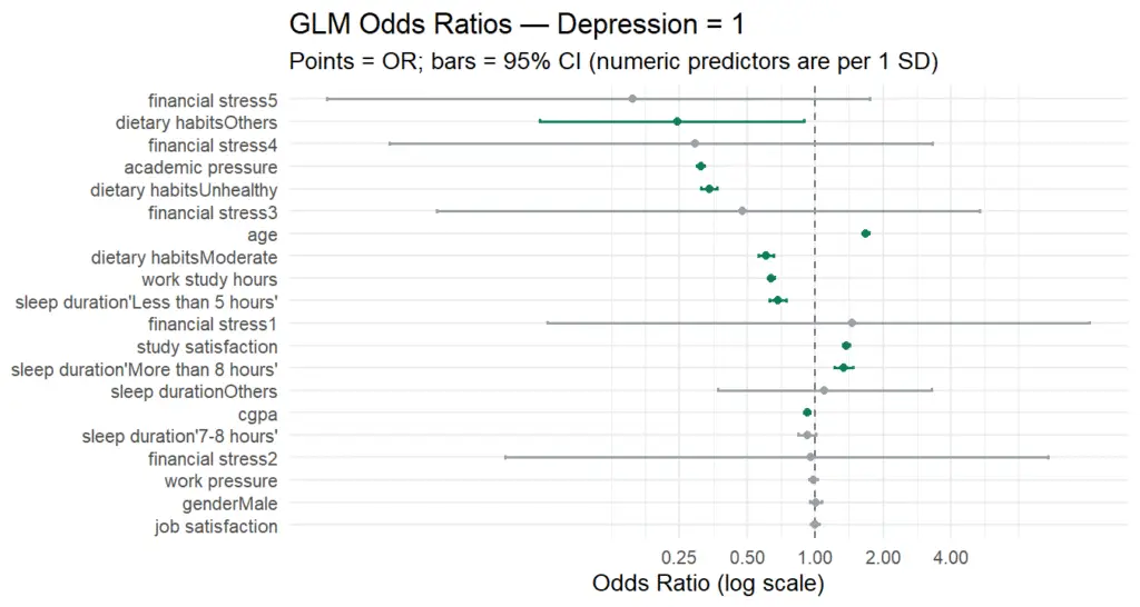 Figure: GLM-derived odds ratios highlighting statistically significant risk-increasing and protective factors for depression.