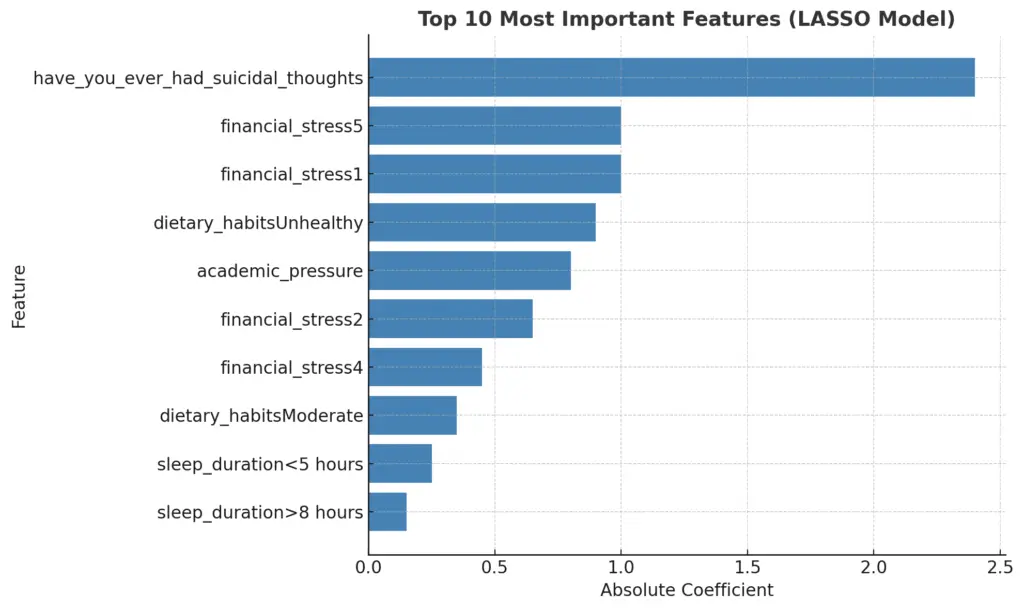This project evaluates and compares GLM and LASSO logistic regression models for predicting depression risk in ~27,900 students. The study emphasizes interpretability, cross-validated performance, and feature-level analysis to identify robust psychological and lifestyle predictors.